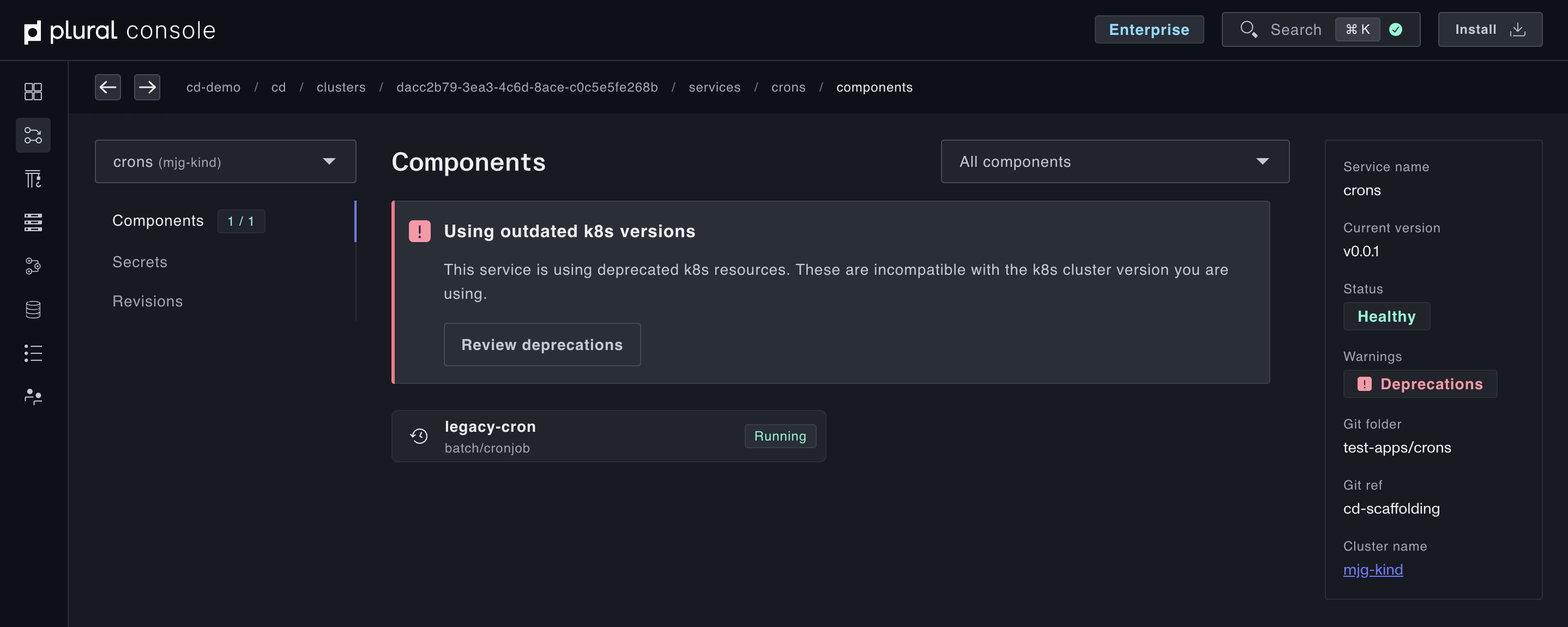 Plural will automatically surface deprecated resources detected on the cluster, and link to the location in Github for review.